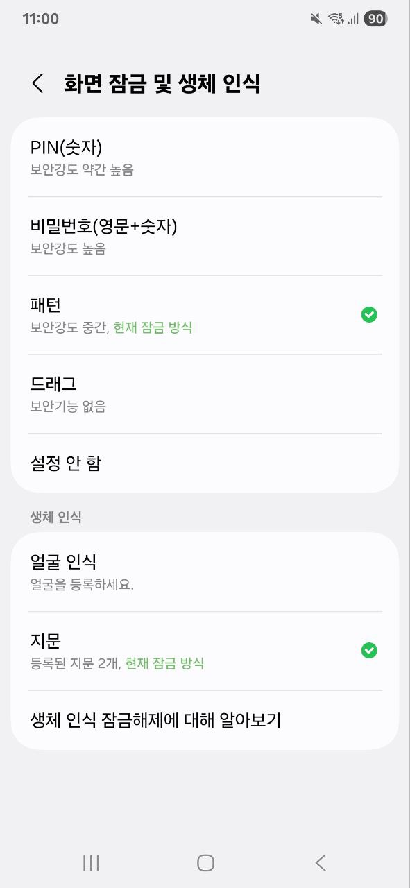 - 설정 → 잠금화면 → 화면 잠금 유형에서 PIN, 패턴, 비밀번호, 지문, 얼굴 인식을 선택할 수 있습니다.